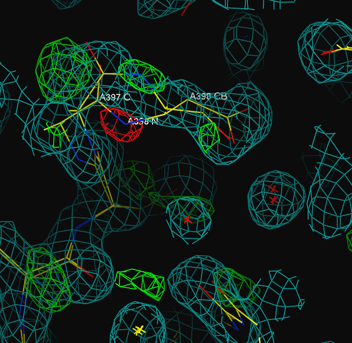 Wolinella succinogenes flavoprotein has a cis-Asp! Model w atom labels is 2BS2, maps calculated with phases from it using SF's sf2bs2.cif. Other model is chicken complex II, superimposing the FAD domain.