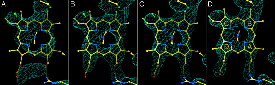 The heme ring density (contoured at 2.0 sigma) is in contact with helix A at