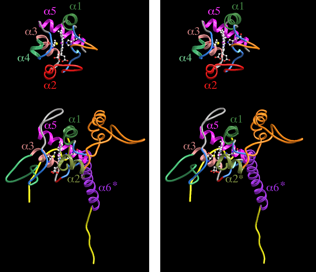 (stereo pair). Above is a ribbon diagram of mitochondrial cytochrome c in a