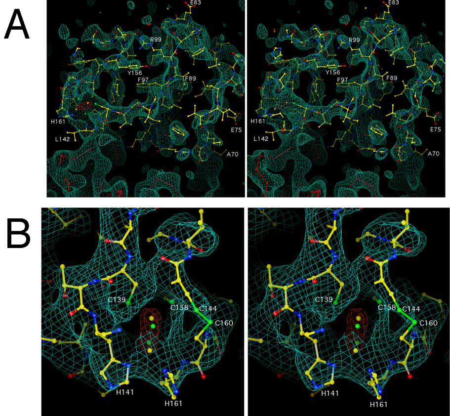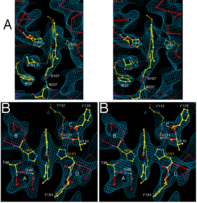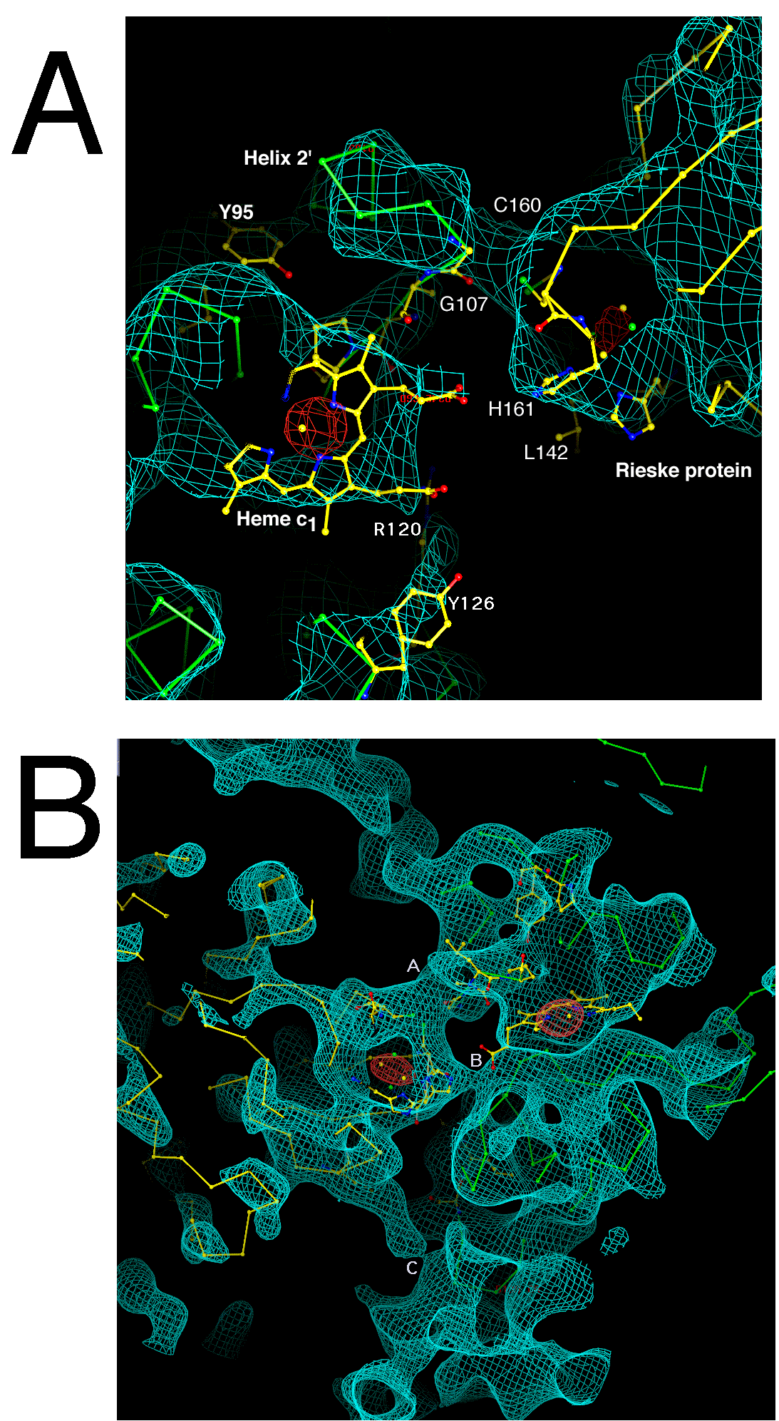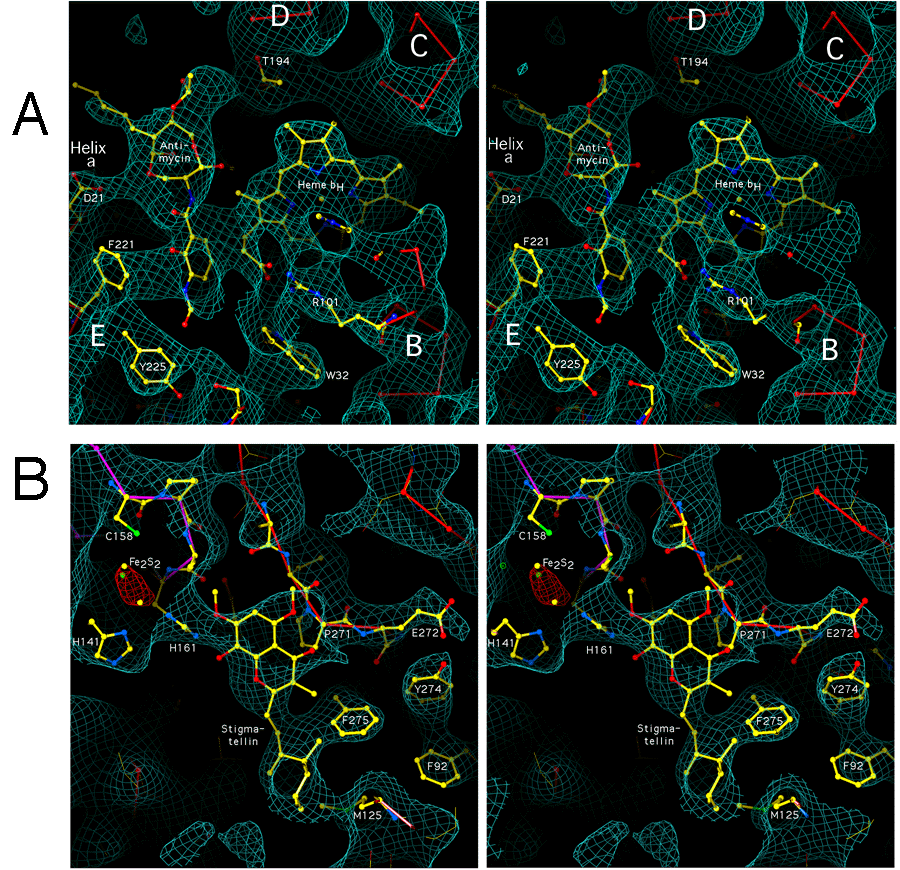 Figure 5. Inhibitor binding sites. Inhibitor crystals were phased initially with improved/extended phases of the native crystal for determining molecular replacement parameters, then rephased by molecular replacement using electron density of the native crystal as a model. These phases were further improved by molecular averaging over non-crystallographic symmetry and over other chicken crystals. Blue maps are electron density from the inhibitor-containing crystal. [Orange maps are difference maps, inhibitor minus native]. A. Antimycin. B. Stigmatellin.