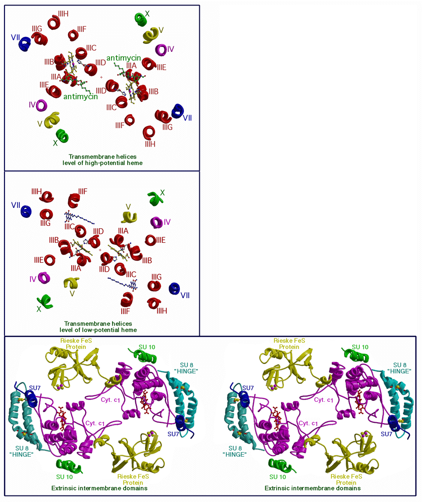 Figure 3c shows a slab including the extrinsic domains in the inter-membrane region. The two cytochrome c1 molecules(purple) interact with each other through loops which surround an empty area around the two-fold axis. The hinge protein (light blue) and the external ends of subunits 7 (dark blue) and 10 (green) interact with cytochrome c1 on the side away from the dimer interface.