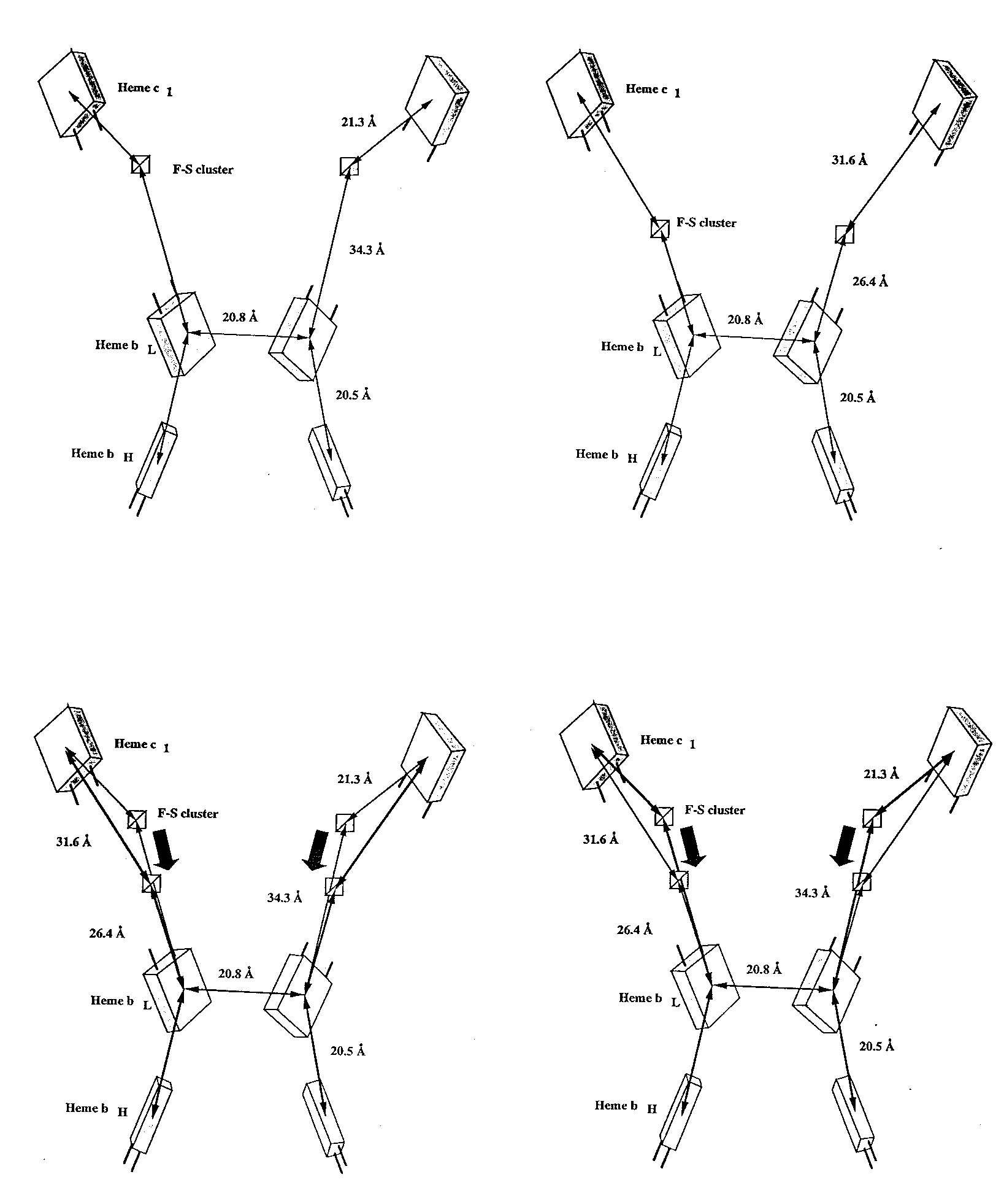 Figure 8. Relative positions of the redox centers in the two different conformations. Left- From a native crystal, with Rieske in the distal position. Right- From a crystal with stigmatellin present, with the Rieske protein in the proximal position.