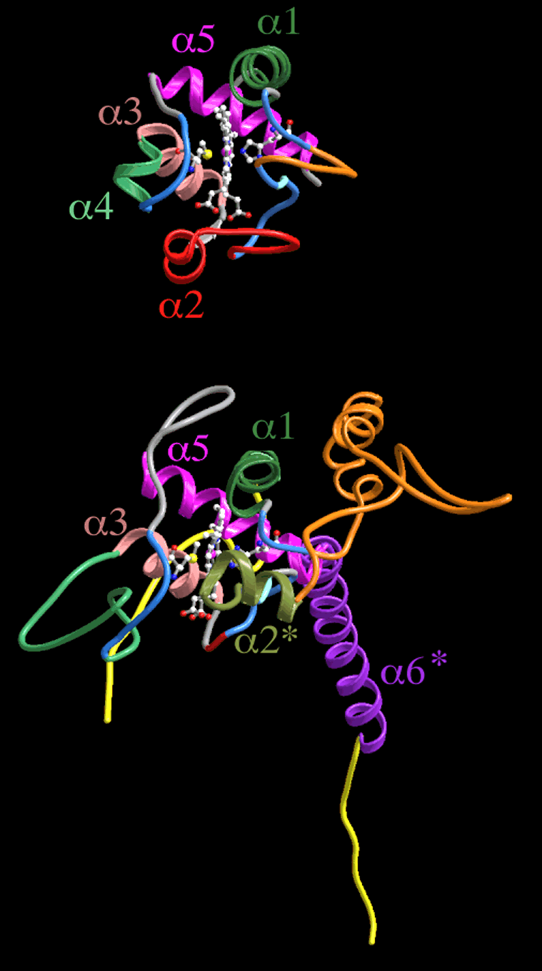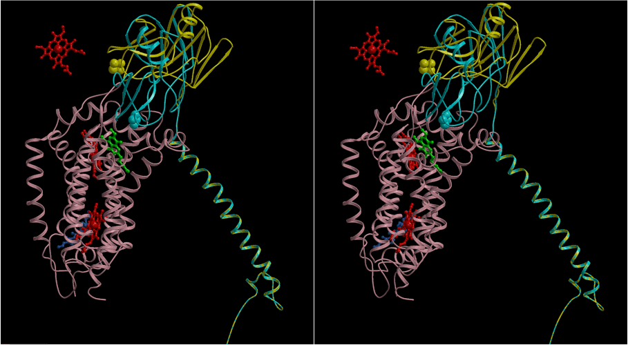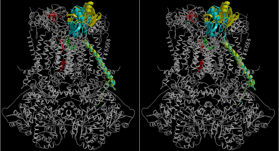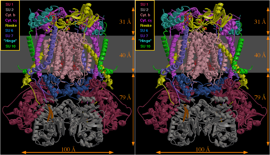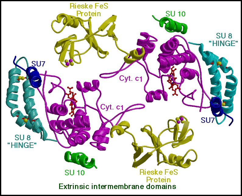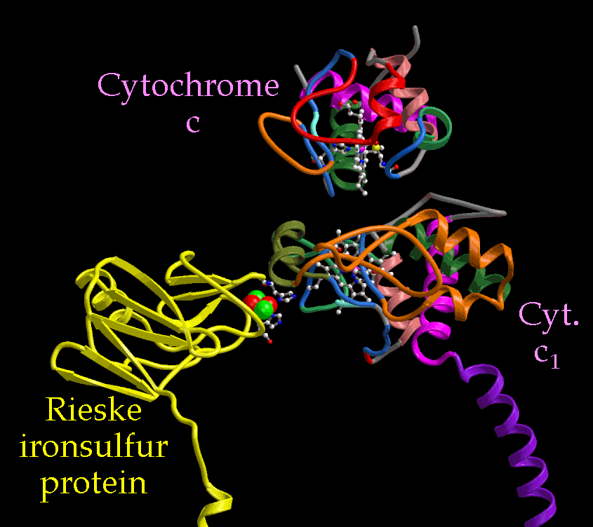backbone of cytochrome b is in red and that of the ironsulfur protein is in