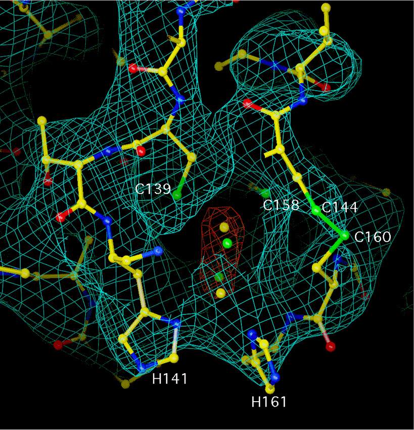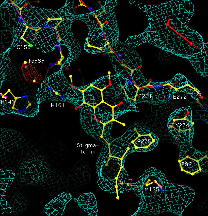 contoured at 0.8 (blue) and 5.0 (orange) for the ironsulfur cluster. The
