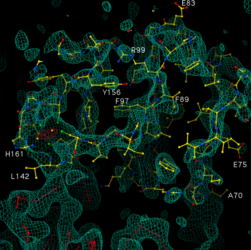 through 8 and 10 in the electron density of the chicken crystal. We assign