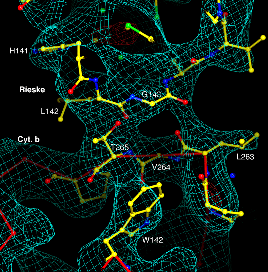 cytochrome c1 and the Rieske protein. The electron density map is from
