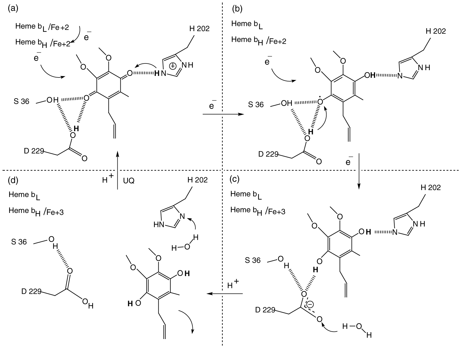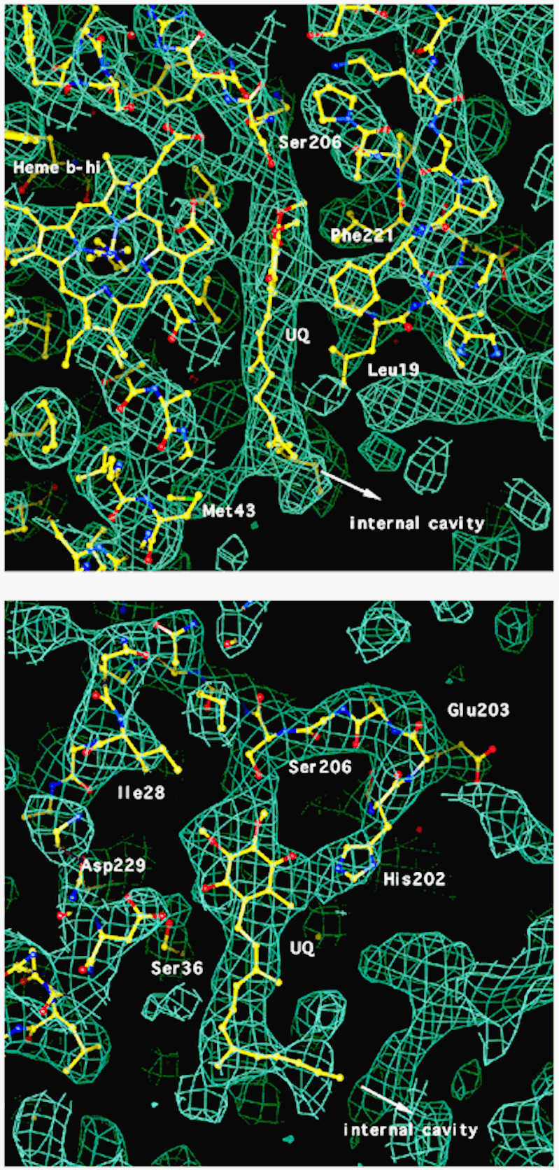 I site in native chicken crystals. The refined model of the complex, superimposed on a 2Fo-Fc map, where Fc and Fc are calculated from the refined model with ubiquinone and all atoms within 3.5 A of the quinone omitted to avoid phase bias, contoured at 0.9 s. The superimposed model is the refined structure of the complex, including ubiquinone with its headgroup in the center of the figure. Panels A and B show two different views related by a 90' rotation about a vertical axis.Figure 2. A plausible model for H+ and e- transfer details for the reactions at the Qi site. The protons consumed in reduction of the quinol come from the H-bonding residues D229 and H202, which are reprotonated after dissociation of the quinol.