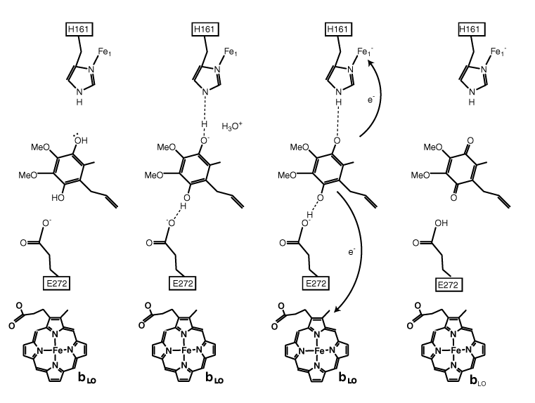Figure 3. A plausible model for H+ and e- transfer details for the reactions at the Qo site. Hydroquinone binds to deprotonated E272 of cytochrome b and binds with release of a proton from H161 of the Reiske protein. After electron transfer the oxidized quinone unbinds leaving E272 and H161 protonated.